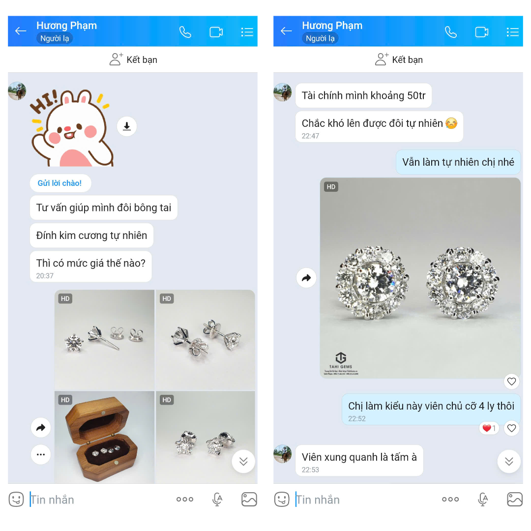 Sau khi trao đổi và tư vấn chi tiết về kiểu dáng, kích thước kim cương cũng như phong cách thiết kế phù hợp, TahiGems đã đề xuất cho chị mẫu Bông tai Tahi 7077 (https://tahigems.vn/san-pham/bong-tai-tahi-7077).