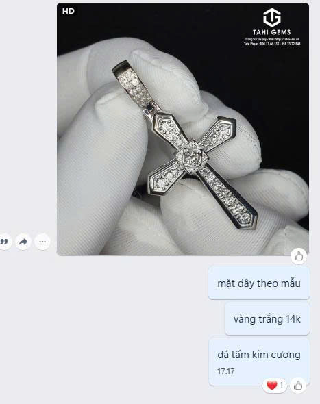 Sau khi tham khảo các mẫu tại TahiGems, anh đã lựa chọn mẫu mặt dây Thánh Giá đính kim cương Tahi 5447 (https://tahigems.vn/san-pham/tahi-5447-mat-day-chuyen-thanh-gia-dinh-kim-cuong) làm thiết kế tham khảo cho sản phẩm của mình.