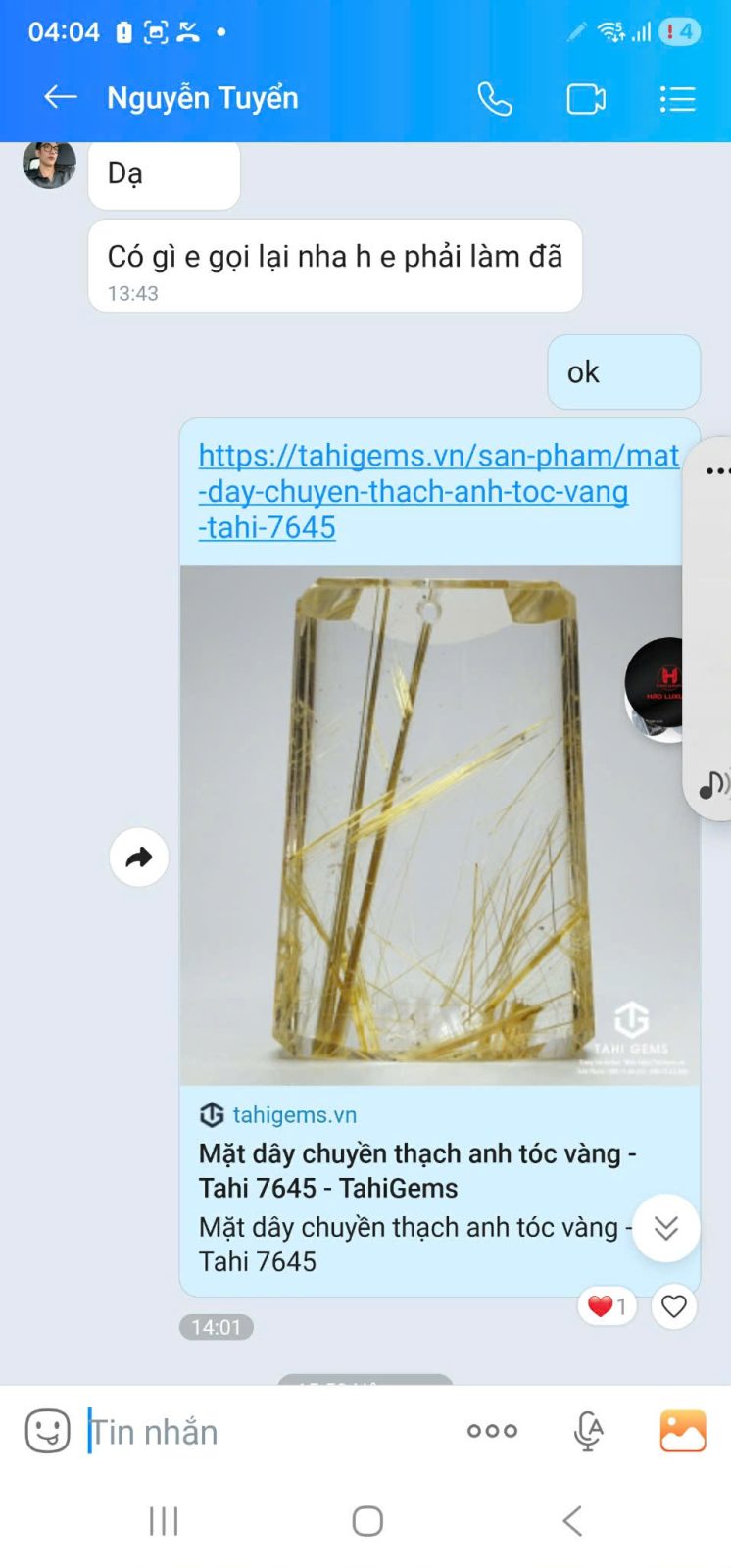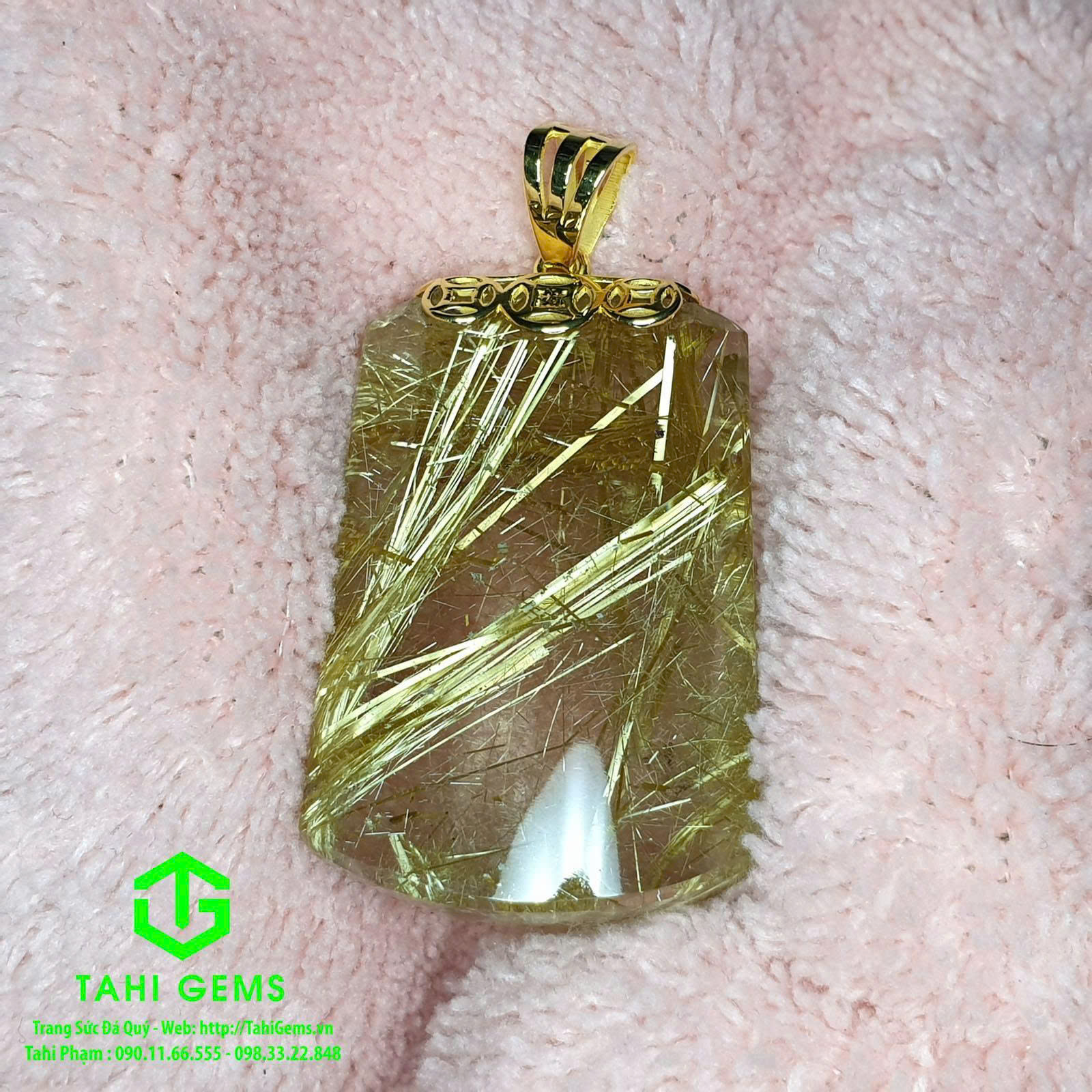 Anh Tuyển hiện đang sinh sống và làm việc tại Nhật Bản. Sau một thời gian theo dõi các sản phẩm của TahiGems, anh đã lựa chọn mặt dây Thạch Anh Tóc Vàng (Tahi 7645) để thực hiện làm mặt dây đeo vì yêu thích sắc vàng ánh kim tự nhiên cùng ý nghĩa phong thủy về tài lộc và may mắn mà dòng đá này mang lại.