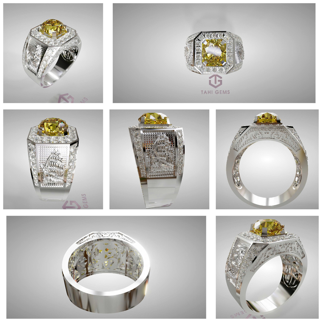 Từ các mẫu anh chọn, TahiGems đã tiếp nhận đầy đủ thông tin và tiến hành lên phương án thiết kế riêng, kết hợp ưu điểm của từng mẫu để tạo nên chiếc nhẫn vừa mạnh mẽ, nam tính, vừa tôn được vẻ đẹp của viên Sapphire vàng chủ đạo.
