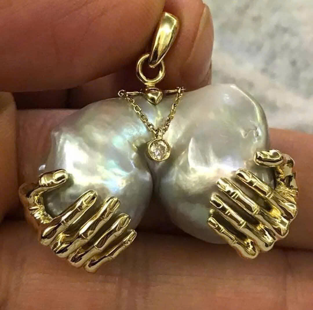 - Thiết Kế Độc Lạ (Art Piece): Ngọc trai được bao bọc bởi hai bàn tay được chế tác tinh xảo từ kim loại màu Vàng Vàng, tạo cảm giác nâng niu, che chở và bảo vệ. Giữa hai viên ngọc trai là một sợi dây chuyền nhỏ đính viên đá tấm trắng (Kim Cương hoặc Moissanite) hình trái tim, nhấn mạnh ý nghĩa về tình yêu, sự gắn kết và lòng trắc ẩn.