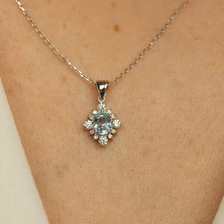 Dây Chuyền Aquamarine Cổ Điển: Dành cho những ai yêu thích vẻ đẹp thanh khiết của đại dương. Viên Aquamarine xanh lam dịu mắt được ôm trọn bởi những cánh hoa đá tấm tinh xảo, mang lại cảm giác bình yên nhưng vô cùng đẳng cấp.