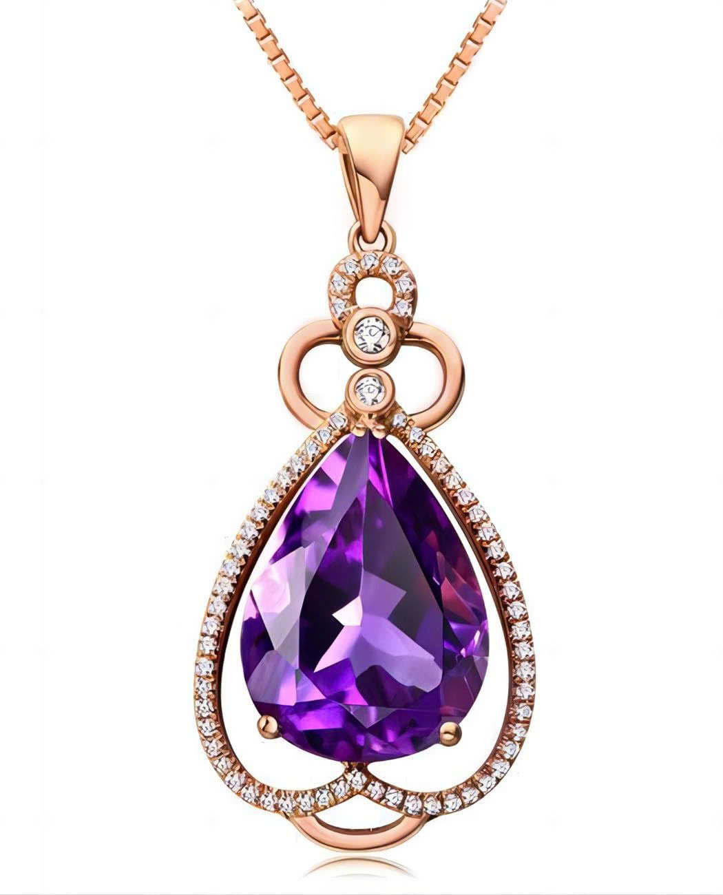 Tâm điểm của mặt dây chuyền là viên Amethyst thiên nhiên với giác cắt Pear Cut (giọt nước) cực kỳ bắt sáng. Màu tím của viên đá không chỉ gợi lên sự huyền bí, thủy chung mà còn là màu sắc đại diện cho tầng lớp quý tộc. Dưới mỗi nhịp chuyển động, sắc tím của đá hòa quyện cùng ánh sáng tạo nên những tia lửa lung linh, mang lại cảm giác bình an và thu hút tài lộc cho chủ nhân.