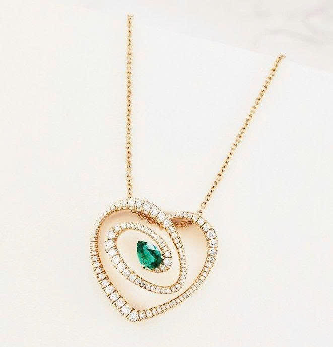 - Trung tâm là viên đá màu xanh (gợi liên tưởng đến emerald – ngọc lục bảo) được cắt dạng giọt nước, mang vẻ đẹp tươi mát và sang trọng.