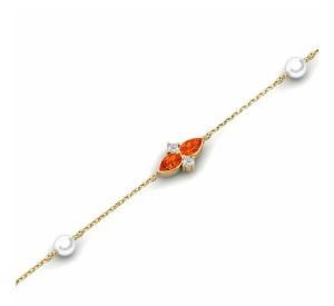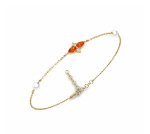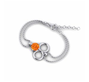 Tâm điểm của chiếc vòng là hai viên đá Citrine cam rực rỡ được cắt dáng lá mềm mại, kết hợp cùng đá trắng lấp lánh, tạo nên sự đối xứng tinh xảo và hiện đại. Sắc cam của Citrine tượng trưng cho niềm vui, may mắn và thành công, giúp người đeo thu hút năng lượng tích cực, tự tin trong công việc và tình yêu.