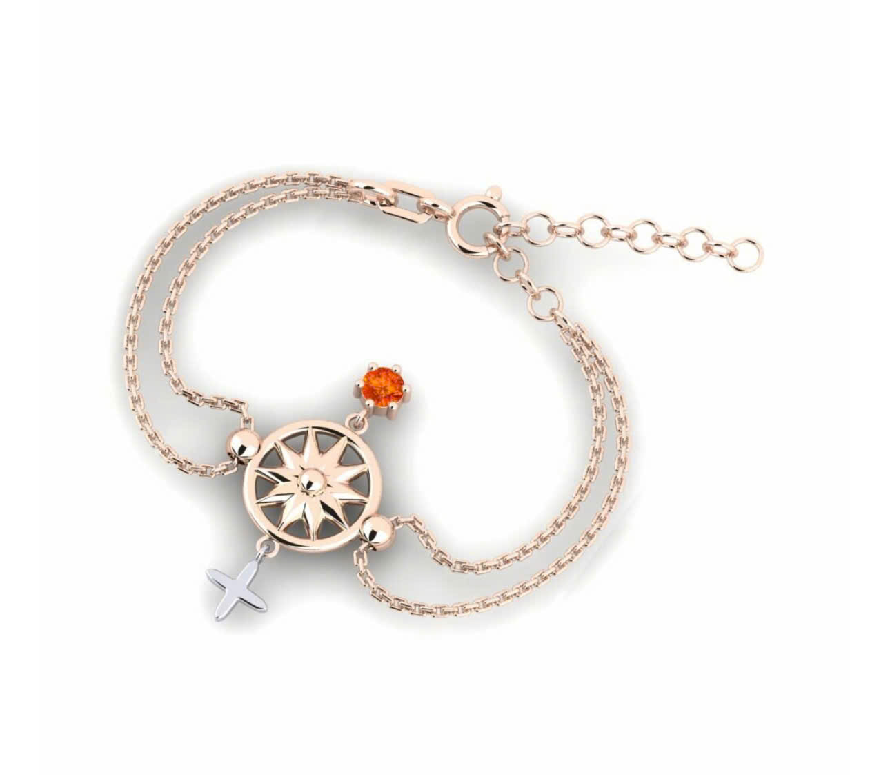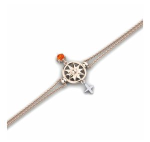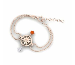 Trung tâm chiếc vòng là mặt la bàn cách điệu tinh xảo, được chế tác từ bạc cao cấp phủ lớp vàng hồng sang trọng, điểm xuyết một viên đá Citrine cam rực rỡ. Sắc cam ánh vàng của Citrine tượng trưng cho ánh sáng, tài lộc và niềm tin, giúp người đeo luôn giữ được sự tự tin và tinh thần lạc quan.