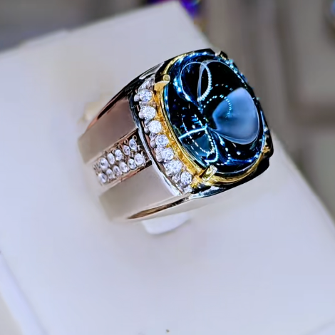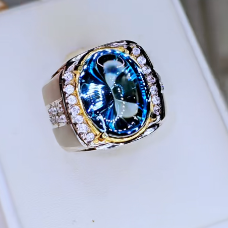 Chiếc nhẫn sở hữu viên đá chủ hình Oval, mang sắc xanh dương sâu thẳm, rực rỡ dưới ánh sáng, đặc trưng của Topaz Xanh Dương (Blue Topaz), đặc biệt là tông màu đậm như London Blue Topaz.