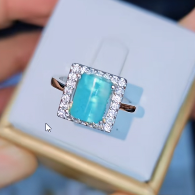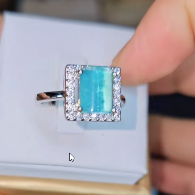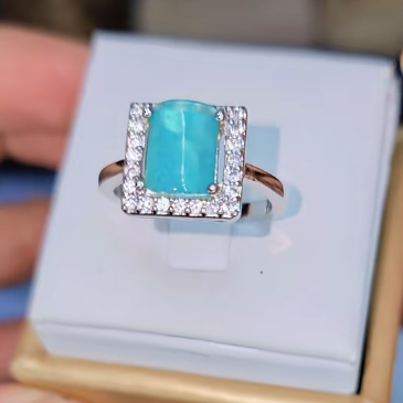 Chiếc nhẫn nổi bật với viên đá chủ hình chữ nhật có màu Xanh Lam Ngọc (Aqua Blue/Mint Green), gợi nhớ đến màu sắc của đại dương nhiệt đới hoặc bầu trời trong xanh. Viên đá này có thể là Amazonite hoặc một loại Chalcedony Xanh cao cấp.