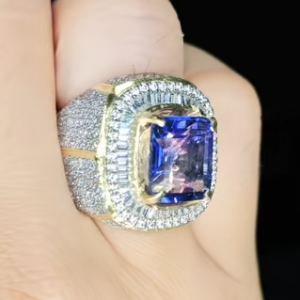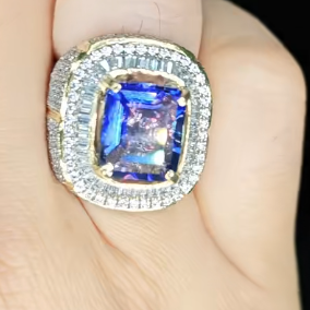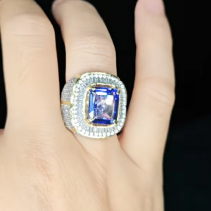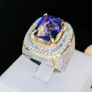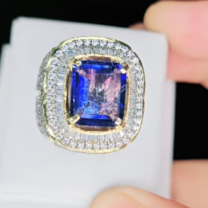 - Loại Đá (Dự đoán): Dựa trên sự biến đổi màu sắc từ xanh lam đậm, tím, đến hơi vàng/hồng dưới ánh sáng (hiện tượng Đa Sắc), viên đá chủ này khả năng rất cao là Tanzanite hoặc một loại Sapphire đa sắc (Bi-Color Sapphire). Nếu là Tanzanite, đây là viên đá cực kỳ quý hiếm, chỉ tìm thấy ở Tanzania.