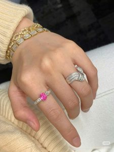 - Đặc điểm: Viên đá chủ có sắc Hồng Tươi ngọt ngào, được cắt giác Oval Faceted, đặt giữa một hàng đá tấm lấp lánh. Kích thước viên đá vừa phải, rất phù hợp với ngón tay phụ nữ.