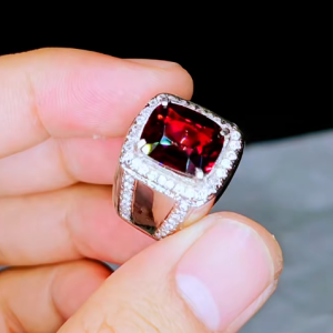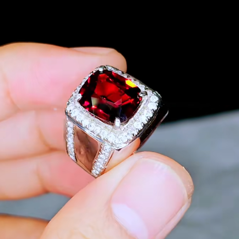 Viên đá chủ có sắc Đỏ Thẫm hoặc Đỏ Tím (Garnet hoặc Ruby), được cắt mài dáng vuông cushion lớn, tạo nên độ sâu và sự bùng cháy của màu sắc. Sắc đỏ này luôn được coi là màu của quyền lực, nhiệt huyết và sự thịnh vượng.