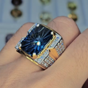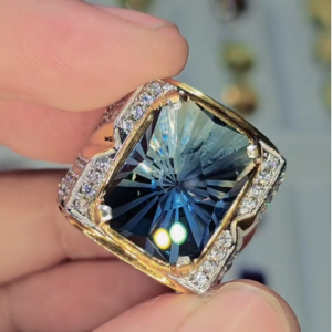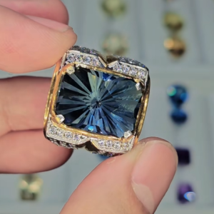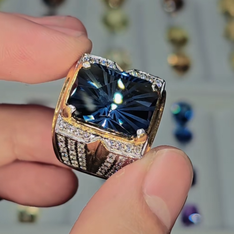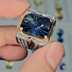 Viên đá chủ có sắc Xanh Dương Thẫm (Deep Blue), chuyển màu sang Tím (Violet) dưới ánh sáng khác nhau (hiệu ứng đa sắc), đây là đặc điểm của các loại đá quý hiếm như Sapphire hoặc Tanzanite. Viên đá được cắt mài tinh xảo theo kiểu Fancy Cut hoặc Round Brilliant lớn, tối ưu hóa độ sâu và sự lấp lánh.