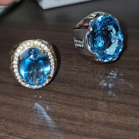 • Viên đá chủ màu xanh dương (xanh biển) tuyệt đẹp, có độ trong và độ tán sắc cao, rất có thể là Blue Topaz (Hoàng Ngọc Xanh Dương).