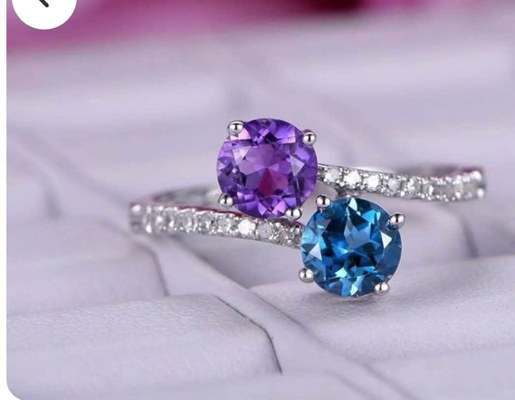 - Chất liệu: Kim loại màu trắng (Vàng trắng hoặc Bạc mạ Rhodium), làm nền hoàn hảo cho sự nổi bật của hai màu đá Tím và Xanh Dương.