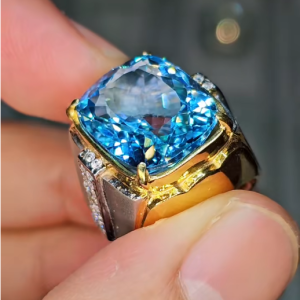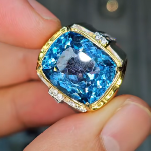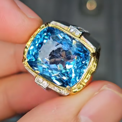 • Viên Đá Chủ: Với sắc Xanh Biển (Sky Blue/Swiss Blue) trong trẻo và lấp lánh, viên đá này nhiều khả năng là Topaz Xanh hoặc Aquamarine. Màu xanh biển tượng trưng cho hành Thủy, đại diện cho trí tuệ, sự thông suốt, và dòng chảy tài lộc không ngừng.