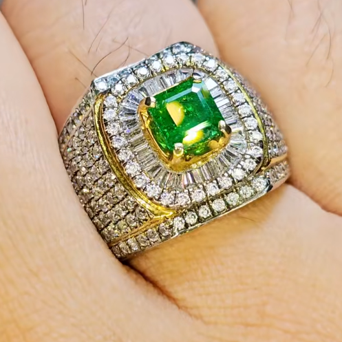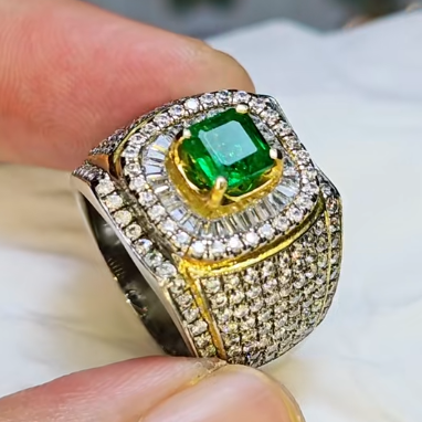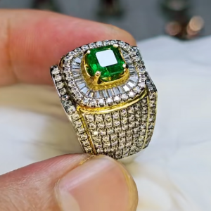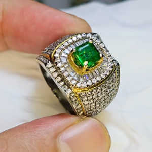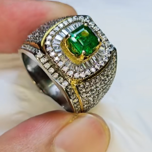 - Viên Đá Quý: Viên đá chủ là một viên Ngọc Lục Bảo (Emerald) hoặc loại đá quý màu xanh lục rực rỡ như Tsavorite/Green Tourmaline, được cắt mài theo kiểu Asscher/Cushion vuông nổi bật. Sắc xanh lục sâu thẳm, tươi mới này được mệnh danh là “màu của hy vọng và sự sống vĩnh cửu”.