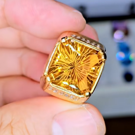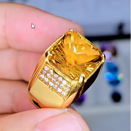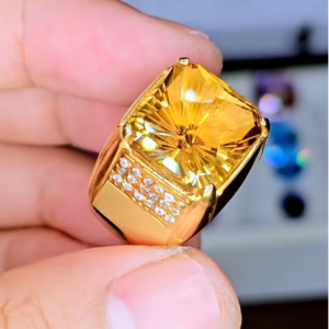 - Viên Đá Quý: Viên đá chủ là Thạch Anh Vàng (Citrine), một biến thể quý hiếm của họ Thạch Anh. Viên đá có sắc vàng đậm, ấm áp tựa ánh nắng mặt trời, được cắt mài giác cắt lớn (Fantasy Cut/Radiant Cut) độc đáo, giúp tăng tối đa độ rực lửa và độ sáng, thể hiện sự sang trọng tuyệt đối.