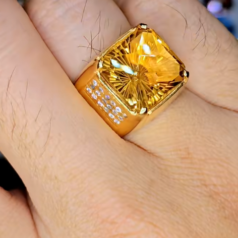 - Đá Phụ Tinh Tế: Một bên đai nhẫn được nạm một hàng Kim Cương Tấm (hoặc Moissanite) trắng sáng, tạo điểm nhấn lấp lánh và tôn lên sắc vàng rực rỡ của viên Citrine.