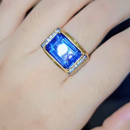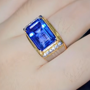 - Đặc điểm Viên Đá: Viên đá chủ hình chữ nhật (Emerald Cut hoặc Radiant Cut) có màu xanh dương đậm (Royal Blue) rực rỡ, độ trong suốt cao. Sapphire là một trong bốn loại đá quý giá trị nhất (Kim cương, Ruby, Sapphire, Emerald).