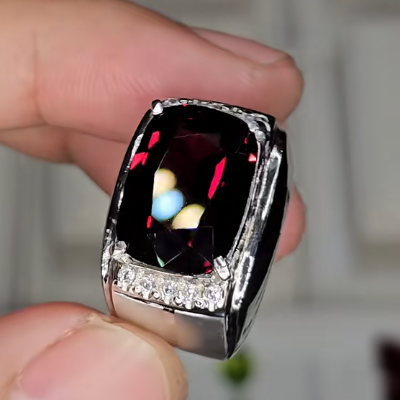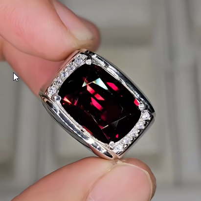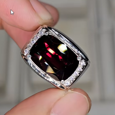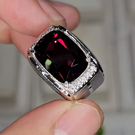 - Loại Đá (Dự đoán): Viên đá chủ hình chữ nhật được mài giác lấp lánh, màu Đỏ Đậm/Đỏ Rượu Vang sang trọng, rất có thể là Garnet (Ngọc Hồng Lựu) hoặc Ruby chất lượng cao.