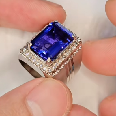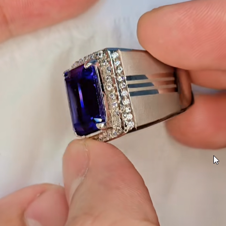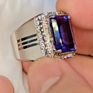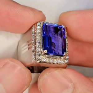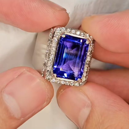 - Viên Đá Chủ: Nổi bật là viên đá quý có sắc Xanh Tím (Violet-Blue) sâu thẳm, rực rỡ và có chiều sâu màu sắc hiếm thấy. Đây có thể là một viên Sapphire Tím Xanh (Blue-Violet Sapphire) quý hiếm hoặc Tanzanite chất lượng cao (một loại đá quý nổi tiếng với khả năng đổi màu từ xanh dương sang tím dưới các điều kiện ánh sáng khác nhau). Viên đá được cắt giác lớn, có thể là Oval (ảnh 1) hoặc Emerald Cut/Octagon (ảnh 2), tối ưu hóa độ phản chiếu và màu sắc.