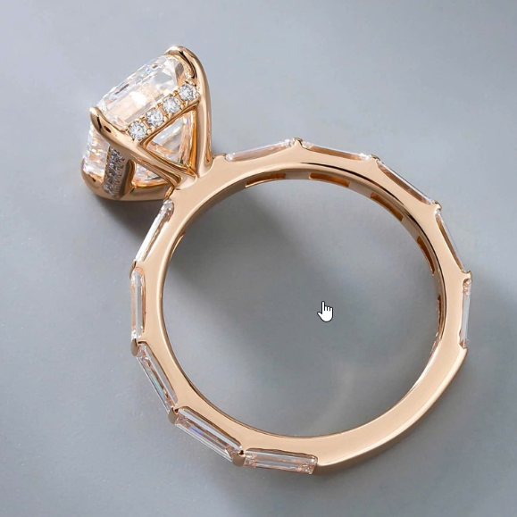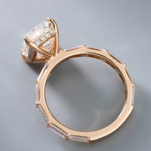 Đai nhẫn Baguette độc bản: Khác với những đai nhẫn trơn thông thường, phần đai được nạm kín những viên kim cương Baguette xếp liền kề. Sự đồng điệu giữa giác cắt của đai và viên chủ tạo nên một tổng thể kiến trúc vững chãi và sang trọng.
