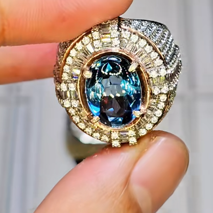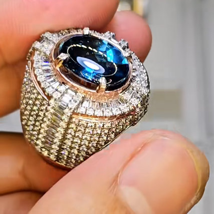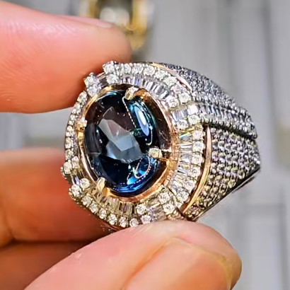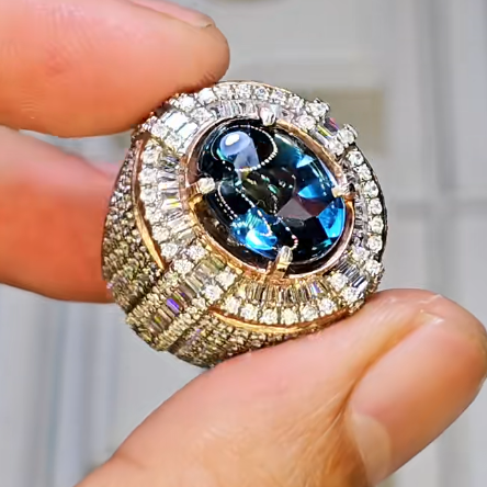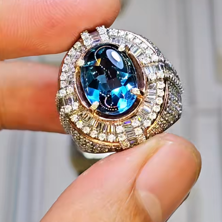 - Viên Đá Quý: Viên đá chủ màu Xanh Dương Đậm (London Blue) hình Oval lớn, có độ lấp lánh và chiều sâu màu sắc ấn tượng. Với sắc xanh thẳm như đại dương, viên đá này nhiều khả năng là Topaz Xanh Dương Đậm (London Blue Topaz) hoặc Sapphire Xanh Dương, nổi tiếng với độ cứng cao và vẻ đẹp quý phái. Màu xanh đậm này tượng trưng cho sự thông thái, lòng trung thành và sức mạnh của biển cả.