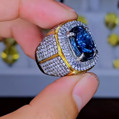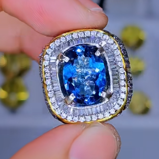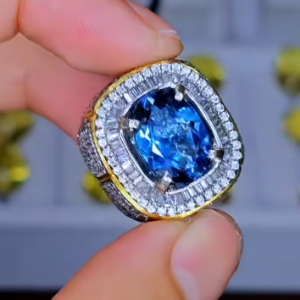 - Viên Đá Quý: Viên đá chủ màu Xanh Dương Sáng và Sâu (Swiss Blue/London Blue Topaz hoặc Sapphire) được cắt giác đệm (Cushion Cut) lấp lánh, phản chiếu ánh sáng rực rỡ và có chiều sâu màu sắc ấn tượng. Sắc xanh dương đậm đà này mang năng lượng của nước, biểu trưng cho sự thông minh, khả năng giao tiếp sắc bén, và lòng trung thành tuyệt đối.