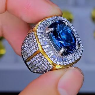 - Phần viền đá phụ (Halo) được thiết kế tinh xảo, sử dụng sự kết hợp giữa kim cương (hoặc đá trắng) cắt hình Baguette (hình chữ nhật) và cắt tròn, tạo ra hiệu ứng tia sáng đa chiều, tăng thêm sự uy lực và lộng lẫy cho viên đá chủ.