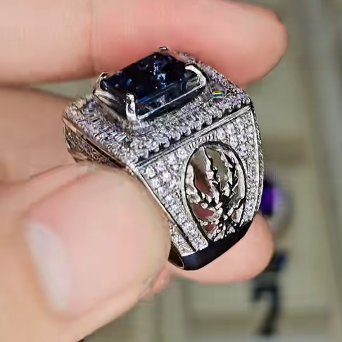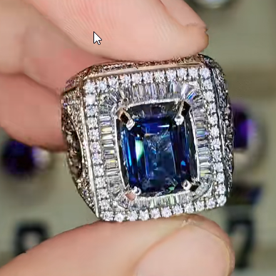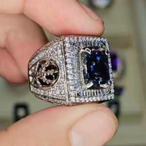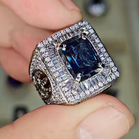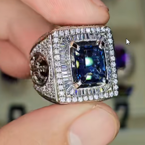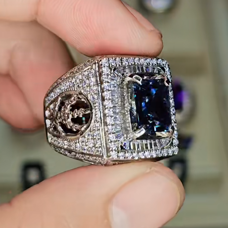 - Viên Đá Chủ: Trung tâm nhẫn là một viên đá quý màu Xanh Dương Đậm (Royal Blue) có độ sâu màu sắc tuyệt vời. Đây nhiều khả năng là một viên Sapphire Xanh Thiên Nhiên quý hiếm hoặc Tanzanite chất lượng cao. Viên đá được cắt giác tinh xảo theo kiểu Emerald Cut (hoặc Octagon/Asscher), một kiểu cắt tôn vinh sự tinh khiết, bề thế và mang lại cái nhìn quyền lực, dứt khoát.