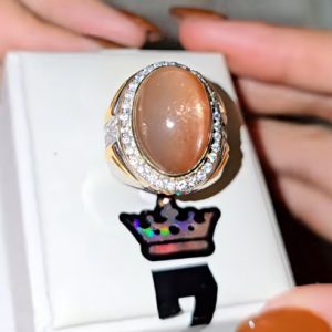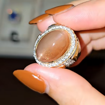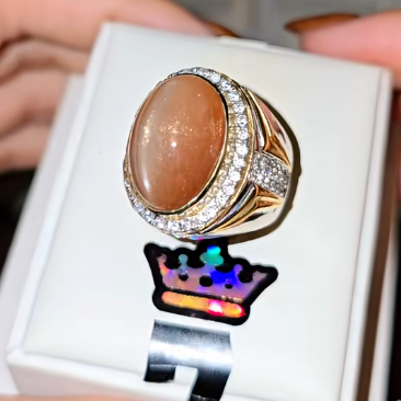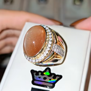 - Viên Đá Chủ: Viên đá có màu Cam Đất/Hồng Cam ấm áp, bề mặt trơn nhẵn (cabochon) với hiệu ứng ánh sáng mờ ảo (có thể là Đá Mặt Trời – Sunstone hoặc một loại Garnet Cam/Hessonit có độ trong mờ). Màu sắc này tượng trưng cho sự sung túc, niềm vui và năng lượng tích cực của mặt trời.