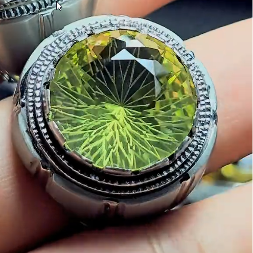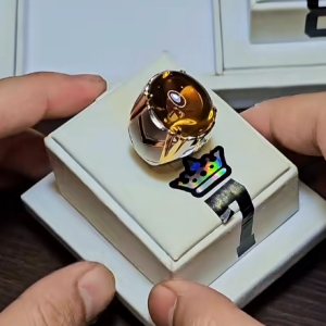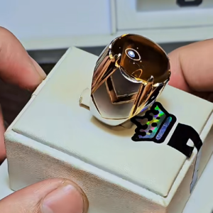 - Thiết Kế: Nhẫn có kiểu dáng Nam Bản Lớn (Signet Ring hoặc Statement Ring), nổi bật với viên đá chủ cỡ đại hình Oval hoặc Cabochon (mài vòm) màu vàng nâu đậm, ánh kim rực rỡ. Phần đai nhẫn dày dặn, được chế tác từ hai loại kim loại màu (có thể là Vàng Trắng/Bạch Kim kết hợp Vàng Vàng) tạo nên họa tiết hình chữ V hoặc các đường nét góc cạnh, mạnh mẽ, ôm lấy viên đá. Sự kết hợp màu sắc kim loại này không chỉ tạo điểm nhấn thị giác mà còn mang ý nghĩa phong thủy về sự hài hòa và cân bằng giữa các yếu tố.