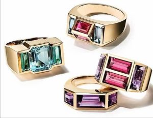 - Đá Quý Đa Dạng: Bộ nhẫn sử dụng nhiều loại đá quý với giác cắt hình học sắc nét (Baguette Cut hoặc Emerald Cut) như: Aquamarine/Topaz (Xanh lam nhạt), Tourmaline/Rhodolite (Hồng/Đỏ Tươi), và Amethyst (Tím).