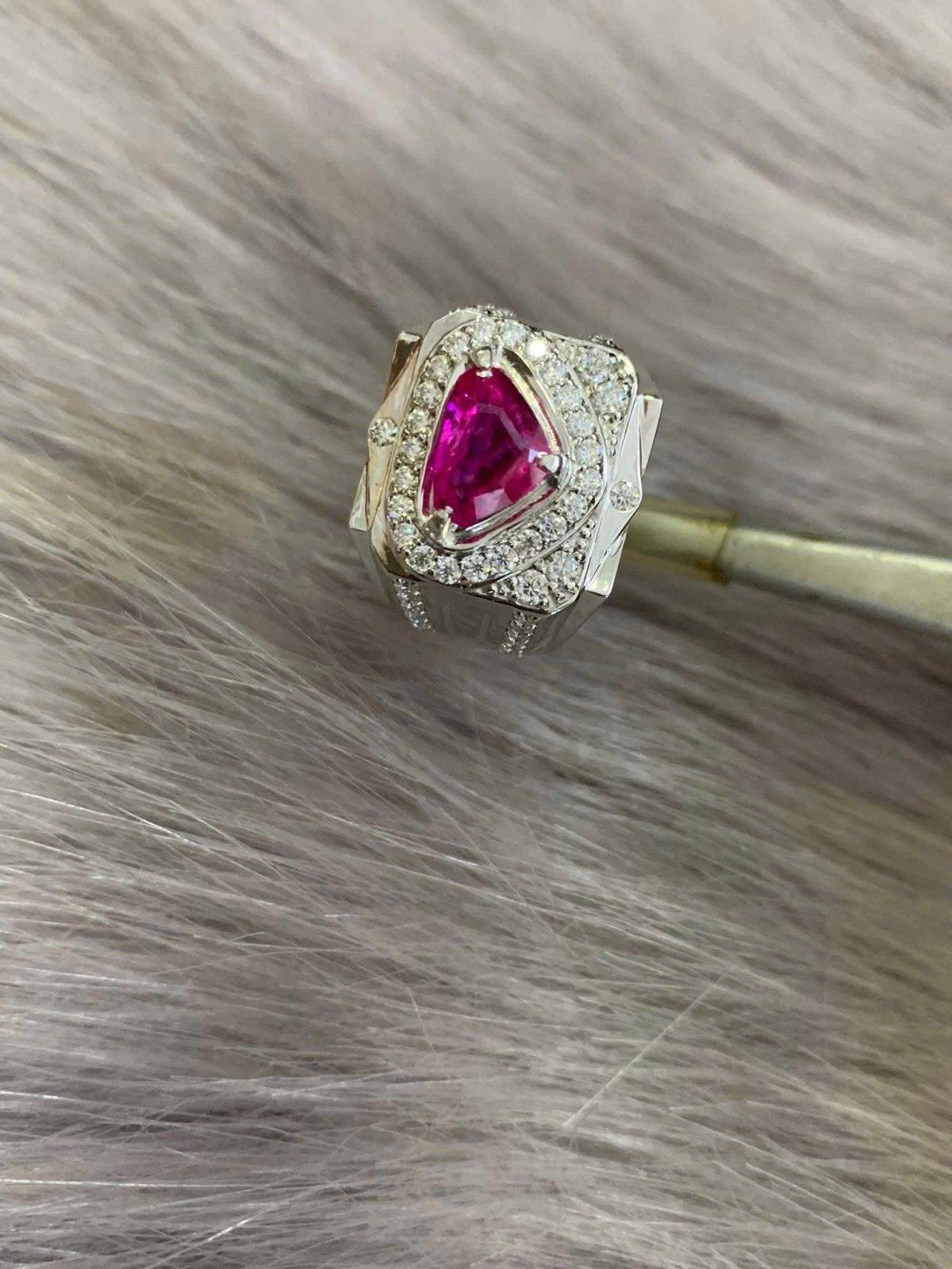 - Đá Phụ: Một viên Kim Cương (hoặc đá trắng) được đính lệch bên cạnh viên Ruby, tạo điểm nhấn lấp lánh và tượng trưng cho sự vĩnh cửu (Kim Cương thuộc hành Kim).