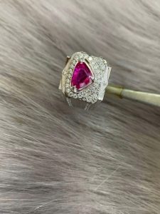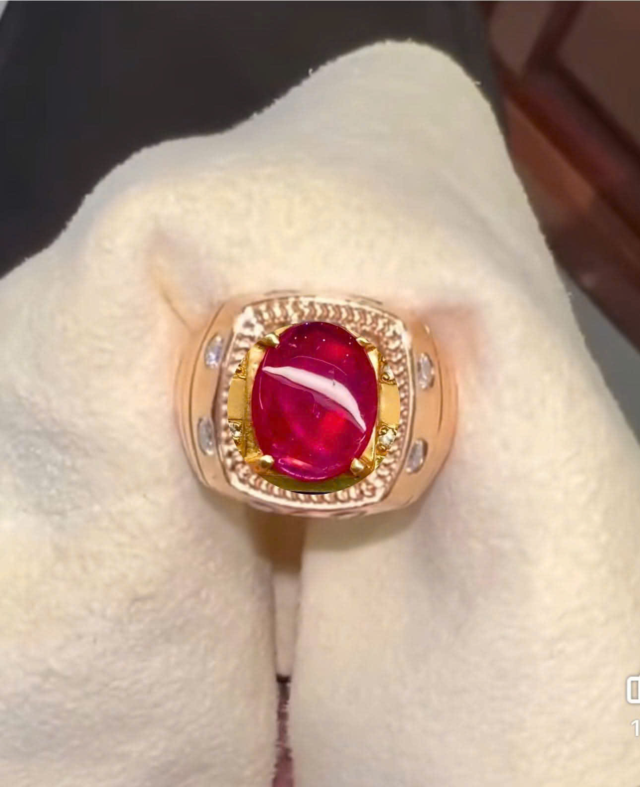 - Đặc điểm: Viên đá chủ có sắc Đỏ Hồng Mãnh Liệt, được cắt kiểu Oval Cabochon (mài trơn, bo tròn). Đặc biệt, viên đá có thể có hiệu ứng Ánh Sao (Asterism), tạo ra một vệt sáng trắng lấp lánh như ngôi sao năm cánh hoặc sáu cánh, chạy dọc bề mặt đá khi xoay.
