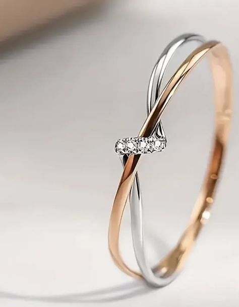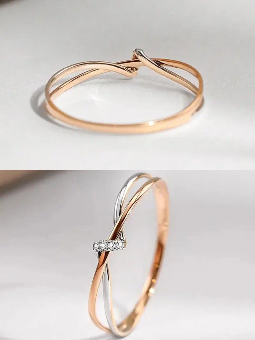 Thiết kế: Chiếc nhẫn gây ấn tượng bởi cấu trúc dual-band (hai vòng dây) đan chéo vào nhau một cách tinh tế. Một vòng mang sắc vàng hồng (Rose Gold) ấm áp, vòng còn lại là vàng trắng (White Gold). Điểm giao nhau được cố định bằng một hàng kim cương tấm lấp lánh, tạo điểm nhấn sang trọng cho tổng thể tối giản.