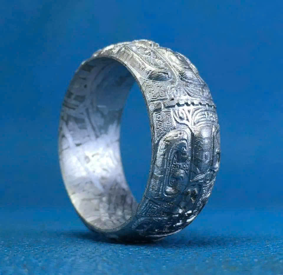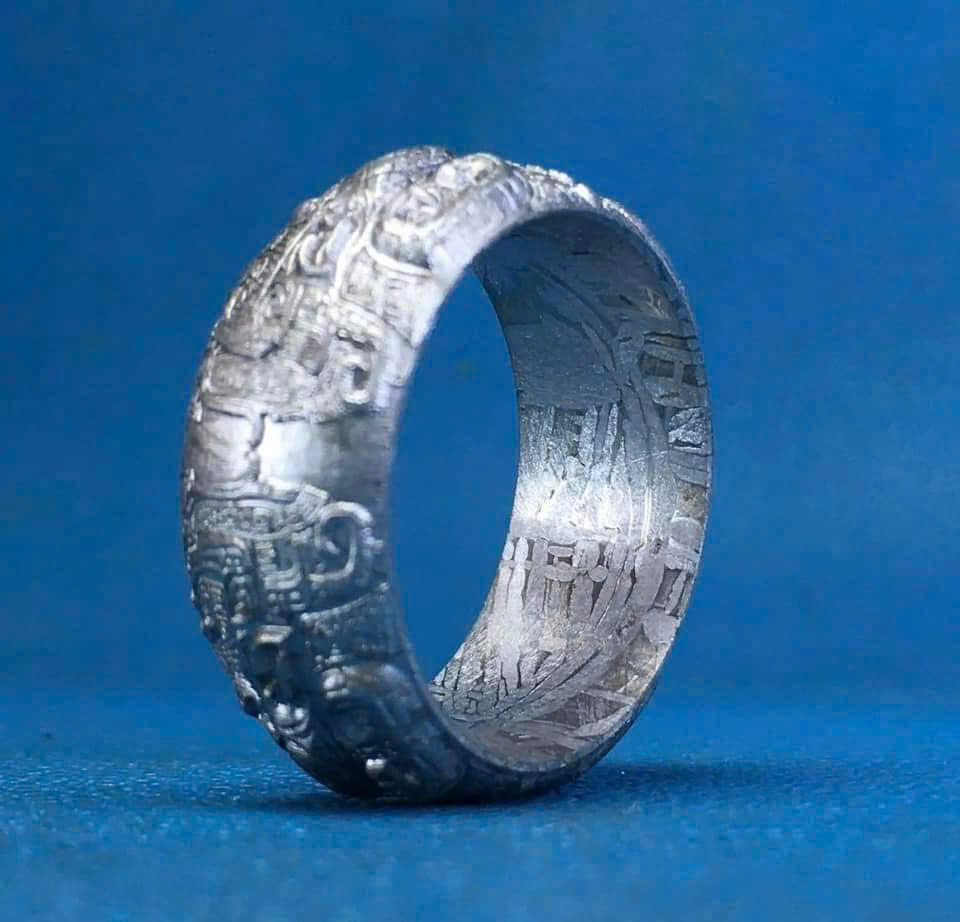 - Họa Tiết Độc Bản: Bề mặt nhẫn lộ ra Họa tiết Widmanstätten (chỉ có thể tìm thấy trong thiên thạch), là những đường vân tinh thể chéo đặc trưng, hình thành qua quá trình làm nguội cực kỳ chậm trong không gian vũ trụ. Đây là bằng chứng không thể chối cãi về sự độc nhất vô nhị của chiếc nhẫn.