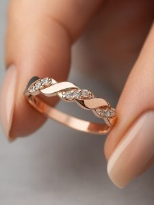 Họa tiết xoắn (Twisted Design): Chiếc nhẫn nổi bật với thân nhẫn được tạo hình như hai dải lụa mềm mại quấn quýt lấy nhau. Một dải được đánh bóng gương hoàn hảo, dải còn lại được đính điểm xuyết những viên đá tấm lấp lánh, tạo nên sự tương phản đầy cuốn hút.