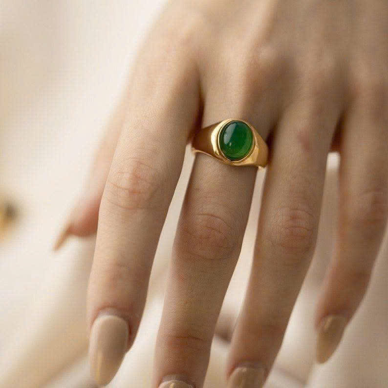 - Chất Liệu Khung Nhẫn: Vàng Vàng (Gold) trơn bóng, tạo sự tương phản ấm áp với viên đá xanh mát lạnh.