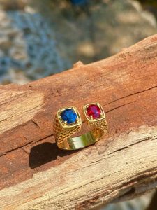 Chiếc nhẫn nổi bật với thiết kế mở (open cuff) và hai viên đá quý có màu sắc tương phản, đều được cắt theo kiểu vuông (Square Cut) sắc nét, mang lại vẻ ngoài mạnh mẽ và hiện đại.