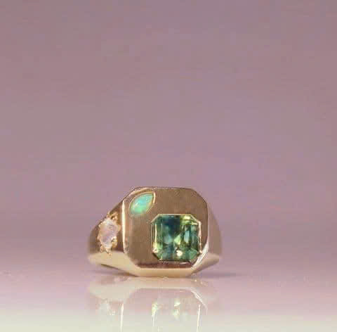 - Đá Phụ Độc Đáo: Các viên đá phụ nhỏ (như Opal/Moonstone và một viên đá tròn khác) được đặt ở góc và bên vai nhẫn. Sự kết hợp các viên đá có hình dạng và tính chất quang học khác nhau (giác cắt và Cabochon) là điểm nhấn nghệ thuật.