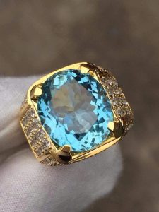 Tóm lại: Đây là một chiếc nhẫn nam vàng vàng, đính một viên đá quý màu xanh da trời khổng lồ, được làm nổi bật bởi hai bên vai nhẫn nạm đầy kim cương lấp lánh.