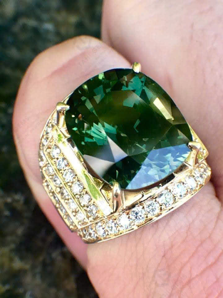 - Viên đá được cố định bằng các chấu lớn (prongs) màu vàng, làm tăng sự chắc chắn và nổi bật. Đây có thể là Tourmaline xanh (Indicolite/Chrome Tourmaline) hoặc một loại đá quý màu xanh lục bảo khác.