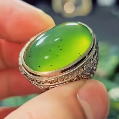Chiếc nhẫn này là một tác phẩm trang sức mang đậm hơi thở của tự nhiên, biểu trưng cho sự sinh sôi, phát triển và trường thọ. Viên đá chủ màu xanh lục tươi sáng, với một vài tạp chất tự nhiên (như các đốm đen nhỏ) chứng tỏ nguồn gốc hoàn toàn từ thiên nhiên, tạo nên vẻ đẹp độc đáo và tràn đầy sinh khí.