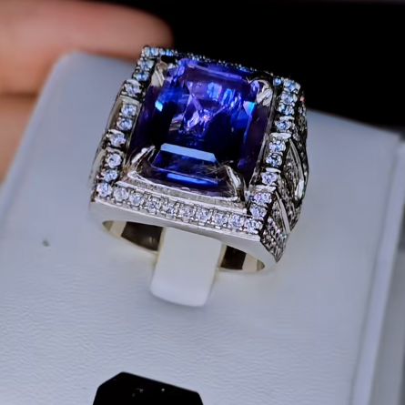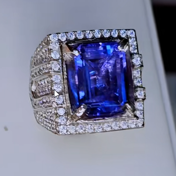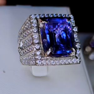 - Viên Đá Quý Chủ – Tanzanite Cắt Giác Emerald Lớn: Viên đá trung tâm tỏa sắc xanh Indigo (xanh chàm) hoặc xanh tím Sapphire đậm, có khả năng cao là Tanzanite chất lượng cao. Điểm đặc biệt là giác cắt Emerald (Lục Giác) vuông vắn, mạnh mẽ, một kiểu cắt được ưa chuộng bởi những người làm kinh doanh và lãnh đạo, tượng trưng cho sự minh bạch, kỷ luật và khả năng quản lý tài chính xuất sắc.