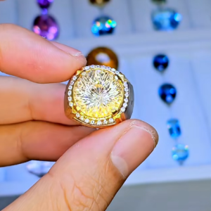 • Phong Cách Thiết Kế: Chiếc nhẫn được thiết kế theo phong cách thời thượng, mạnh mẽ và sang trọng. Viên đá chủ tròn lớn, nổi bật được bao bọc bởi một vòng halo lấp lánh từ các viên kim cương (hoặc đá Cubic Zirconia) nhỏ, tạo nên sự quyền quý và đẳng cấp. Vỏ nhẫn bằng vàng (vàng tây) càng làm tôn lên vẻ rực rỡ của viên đá. Đây là một thiết kế bản to, phù hợp cho cả nam và nữ yêu thích trang sức phong thủy nổi bật.