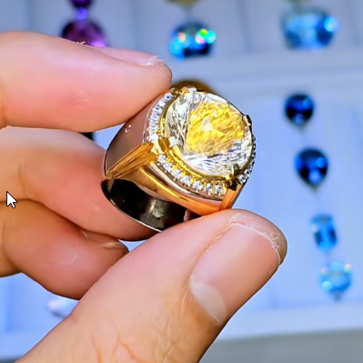 • Viên Đá Chủ: Trung tâm chiếc nhẫn là viên đá quý màu vàng nhạt rực rỡ, được chế tác với kỹ thuật cắt mài tinh xảo, có thể là Citrine (Thạch Anh Vàng) hoặc Topaz Vàng tự nhiên. Đặc biệt, kiểu cắt mài của viên đá rất độc đáo, tạo nên những tia sáng tán xạ như mặt trời, hay còn gọi là cắt Fantasy Cut hoặc Sunflower Cut, làm tăng tối đa độ lấp lánh và năng lượng của viên đá.