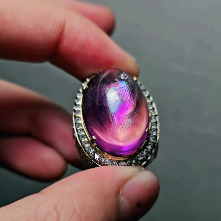 - Viên Đá Chủ: Viên đá trung tâm có màu tím-hồng độc đáo, với hiệu ứng ánh sáng lấp lánh và đường vân rõ rệt bên trong, có thể là Thạch Anh Tím (Amethyst) chất lượng cao hoặc một loại đá quý có hiệu ứng Chatoyancy (mắt mèo) hoặc Schiller (ánh sáng nội tại) đặc biệt. Màu sắc chuyển đổi tinh tế từ tím đậm sang hồng nhạt tạo nên sự lôi cuốn mạnh mẽ.
