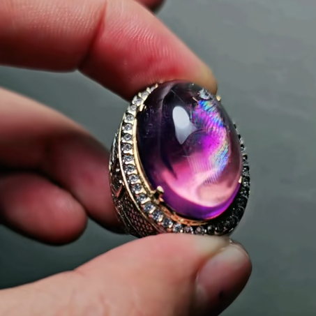 - Phong Cách Thiết Kế: Nhẫn được thiết kế theo phong cách cổ điển, bản lớn và uy quyền. Viên đá chính hình bầu dục (oval) được đặt trong một ổ chấu vững chắc. Vòng bezel (vành bao quanh đá) được nạm kín các viên kim cương (hoặc đá CZ) nhỏ lấp lánh, làm nổi bật viên đá tím rực rỡ và tăng thêm sự sang trọng, đẳng cấp cho người đeo. Thiết kế này phù hợp với những người tìm kiếm sự nổi bật và cá tính mạnh mẽ.