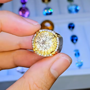 - Viên Đá Chủ: Viên đá trung tâm có màu tím-hồng độc đáo, với hiệu ứng ánh sáng lấp lánh và đường vân rõ rệt bên trong, có thể là Thạch Anh Tím (Amethyst) chất lượng cao hoặc một loại đá quý có hiệu ứng Chatoyancy (mắt mèo) hoặc Schiller (ánh sáng nội tại) đặc biệt. Màu sắc chuyển đổi tinh tế từ tím đậm sang hồng nhạt tạo nên sự lôi cuốn mạnh mẽ.